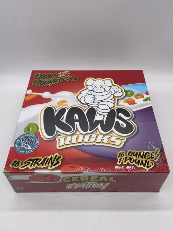 The Kaws Rocks Cereal Edition Box is designed for cannabis enthusiasts seeking an extraordinary experience. This premium product features high-quality cannabis buds infused with THC concentrate and coated in a generous layer of kief, ensuring potency and uniqueness. With THC levels potentially reaching up to 50% or more, the Kaws Rocks Cereal LB Box delivers an intense and long-lasting high perfect for seasoned users.